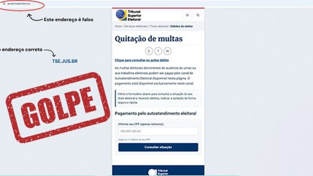 Segundo o tribunal, esta é a segunda tentativa de fraude registrada em 2026. Criminosos utilizam indevidamente o nome e a identidade visual da Justiça Eleitoral para enganar usuários.