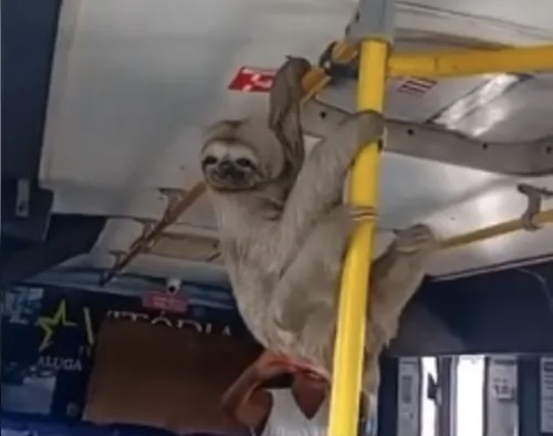 Dentro do veículo, o bicho-preguiça se movimentou lentamente e chegou a se pendurar na barra superior, cenas que divertiram alguns ocupantes — enquanto outros mantiveram distância. As imagens gravadas pelos passageiros se espalharam rapidamente na internet.