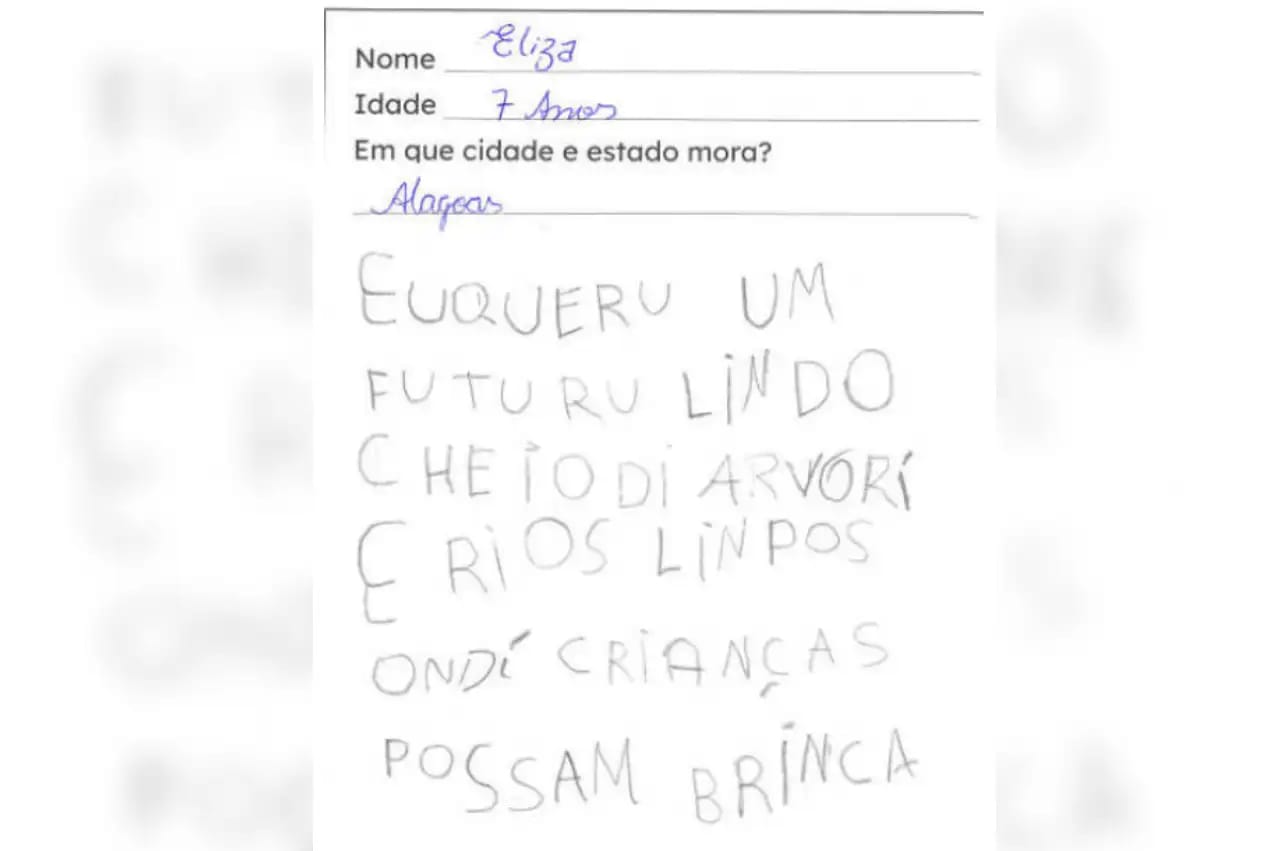 Mas foi a mensagem de Eliza que mais tocou os participantes. Com sua escrita infantil — “futuru lindo cheio di arvori e rios linpos” —, ela sintetizou o que especialistas chamam de esperança climática: a capacidade das novas gerações de imaginar um planeta melhor, mesmo diante de desafios globais.