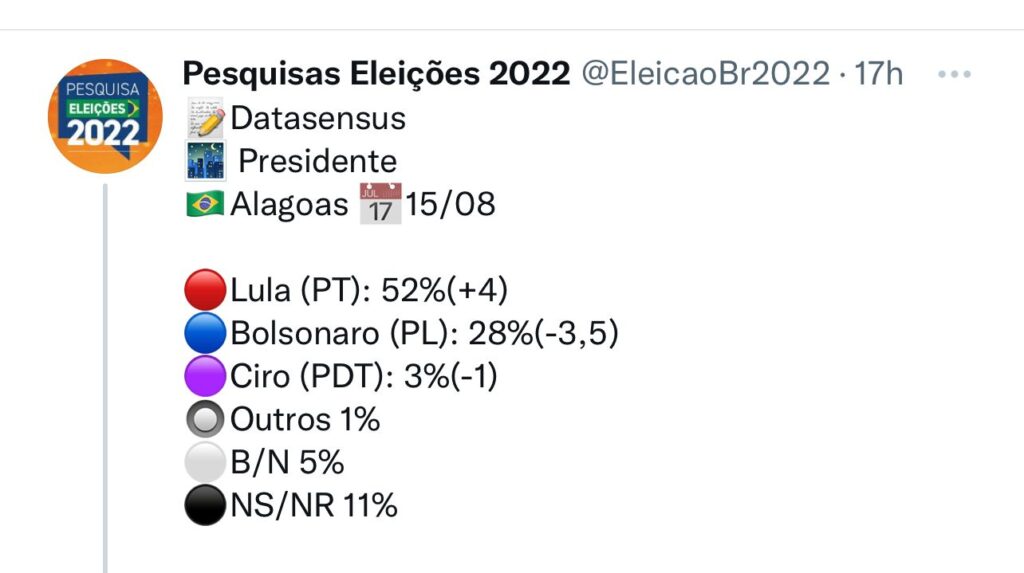 A pesquisa foi realizada entre os dias 12 e 13 de agosto e aponta o atual presidente, Jair Bolsonaro (PL), em segundo lugar, com 25,2% dos votos. Os números podem indicar que a polarização nacional entre Bolsonaro e Lula não atinge Alagoas.