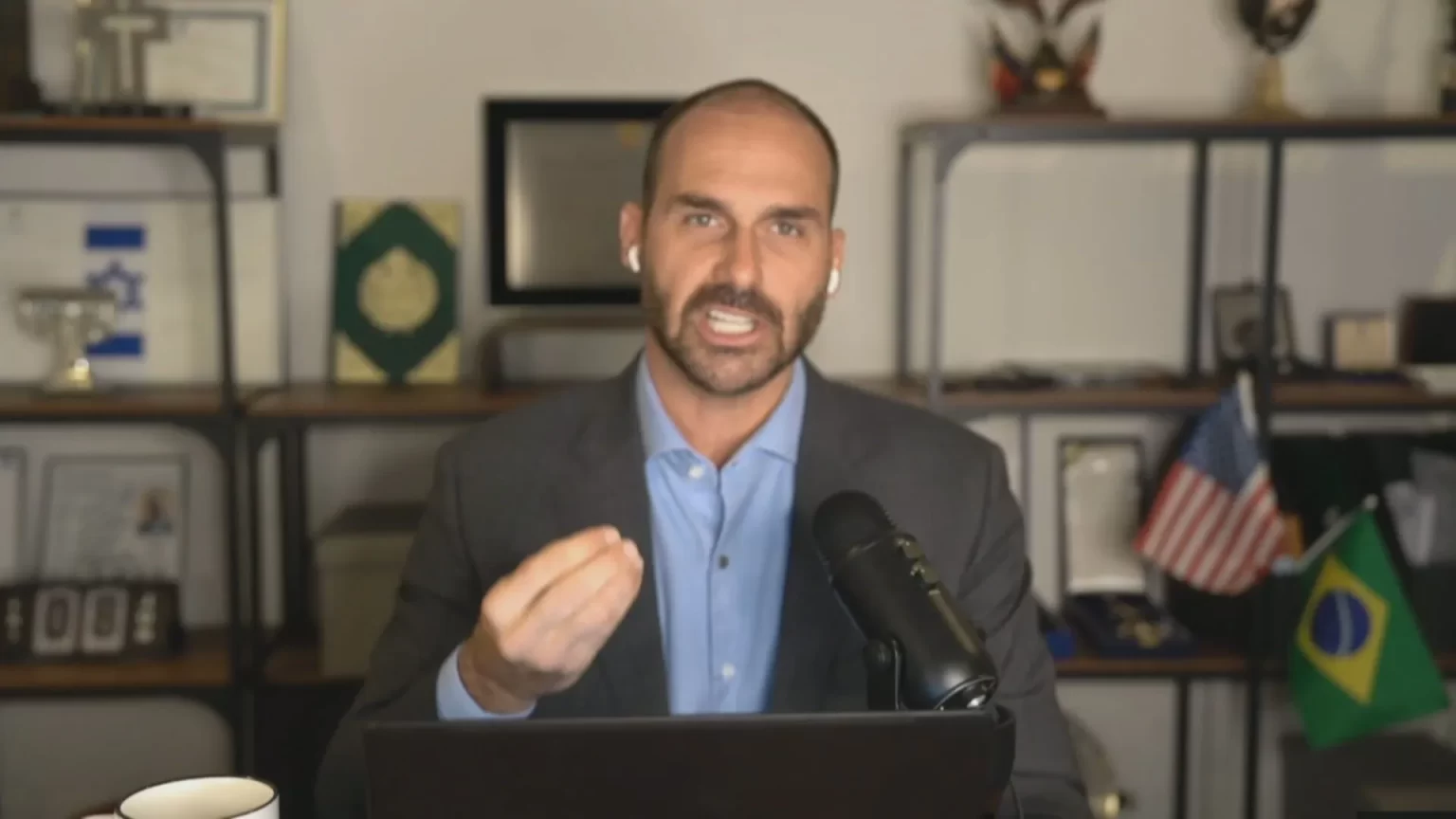 Eduardo Bolsonaro lembra que, na pandemia de Covid-19, deputados participaram de sessões e votações de forma virtual. Segundo ele, a atual “crise institucional” no país tornaria justificável a adoção de um mecanismo similar para seu mandato.