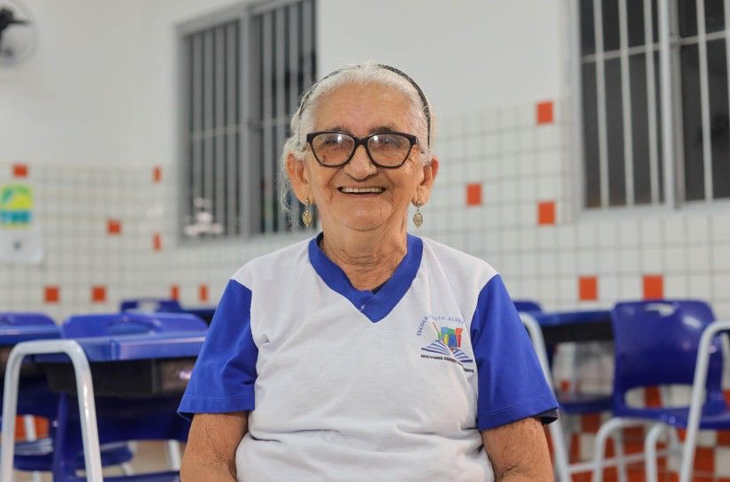 Com sua bolsa larga rosa pink e detalhes de um desenho animado, Amara Gomes Andrade da Silva, de 78 anos, estudante da Educação de Jovens, Adultos e Idosos (EJAI), chega animada e a passos rápidos para mais um dia de aula na Escola Municipal Lenilto Alves, localizada no Jacintinho.