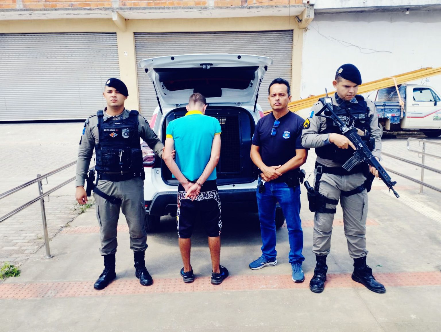 Após o reconhecimento, os policiais deram voz de prisão ao acusado, que precisou ser algemado para garantir a segurança da equipe, conforme determina a Súmula Vinculante nº 11 do STF. Ele foi conduzido ao Hospital de Água Branca, onde passou por exame de corpo de delito.