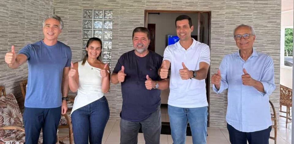 O pré-candidato a deputado estadual Hugo Wanderlei e o deputado federal Rafael Brito receberam o apoio do ex-prefeito de Joaquim Gomes, Adriano Barros, durante visita à sua residência, ao lado da ex-primeira-dama Daniele.