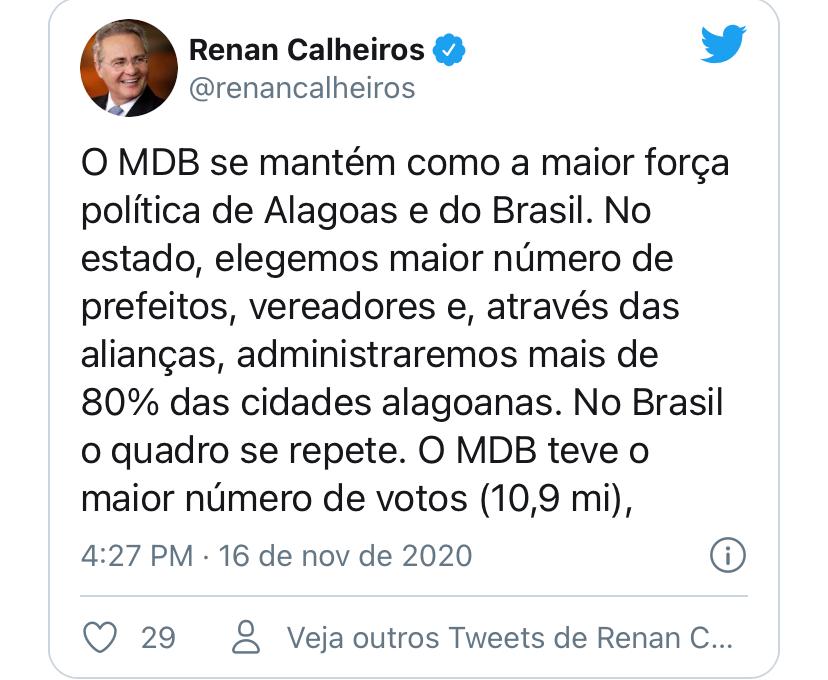O senador Renan Calheiros, presidente do MDB em Alagoas, utilizou sua conta no Twitter para analisar os resultados do partido nas deste ano no Estado e no Brasil.