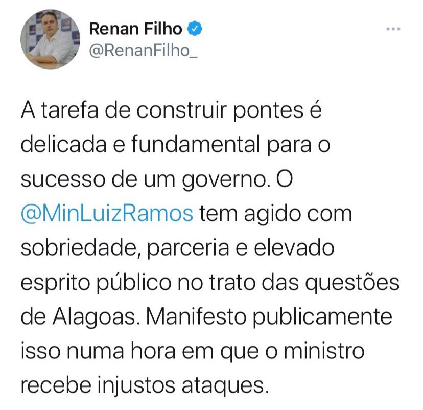 Na postagem Renan Filho afirma que a tarefa de construir pontes é delicada e fundamental para o sucesso do governo. O governador de Alagoas segue afirmando na publicação, que o Ministro Luiz Ramos tem agido com sobriedade, parceria e elevado espírito no trato das questões de Alagoas.