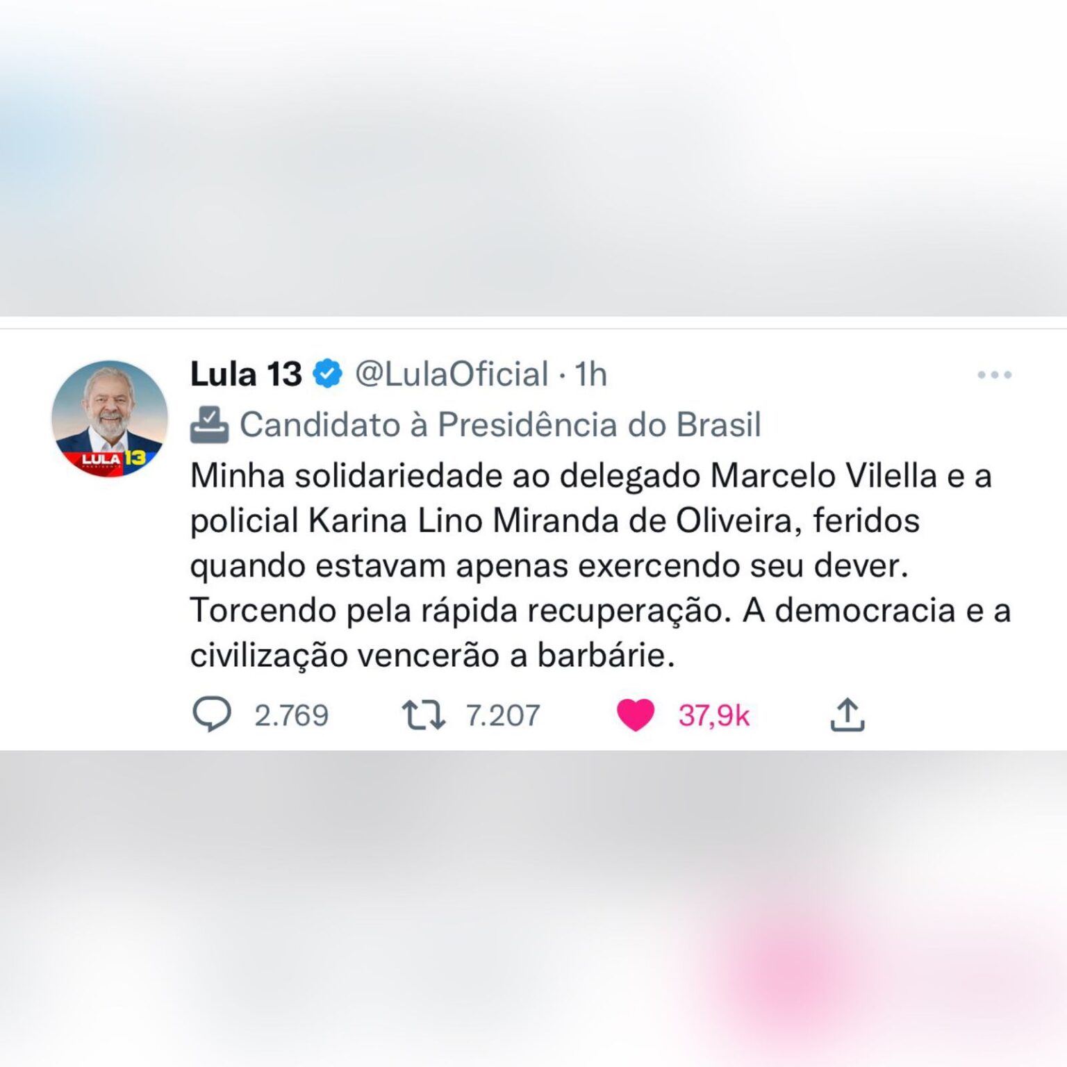 “Minha solidariedade ao delegado Marcelo Vilella e a policial Karina Lino Miranda de Oliveira, feridos quando estavam apenas exercendo seu dever. Torcendo pela rápida recuperação. A democracia e a civilização vencerão a barbárie”, disse o ex-presidente.