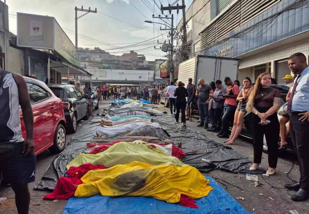 Moradores do Complexo da Penha, na Zona Norte do Rio de Janeiro, levaram pelo menos 55 corpos para a Praça São Lucas, na Estrada José Rucas, uma das principais da região, ao longo da madrugada desta quarta-feira (29), o dia seguinte à operação mais letal da história do RJ.