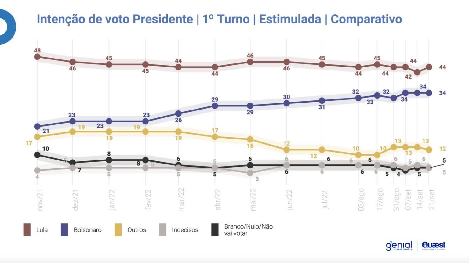 Luiz Inácio Lula da Silva (PT) lidera a corrida presidencial com 44% das intenções de voto no primeiro turno. Em seguida, vem o presidente Jair Bolsonaro (PL) com 34%. Os dados são da pesquisa Genial/Quaest, divulgada nesta quarta-feira (21/9).
