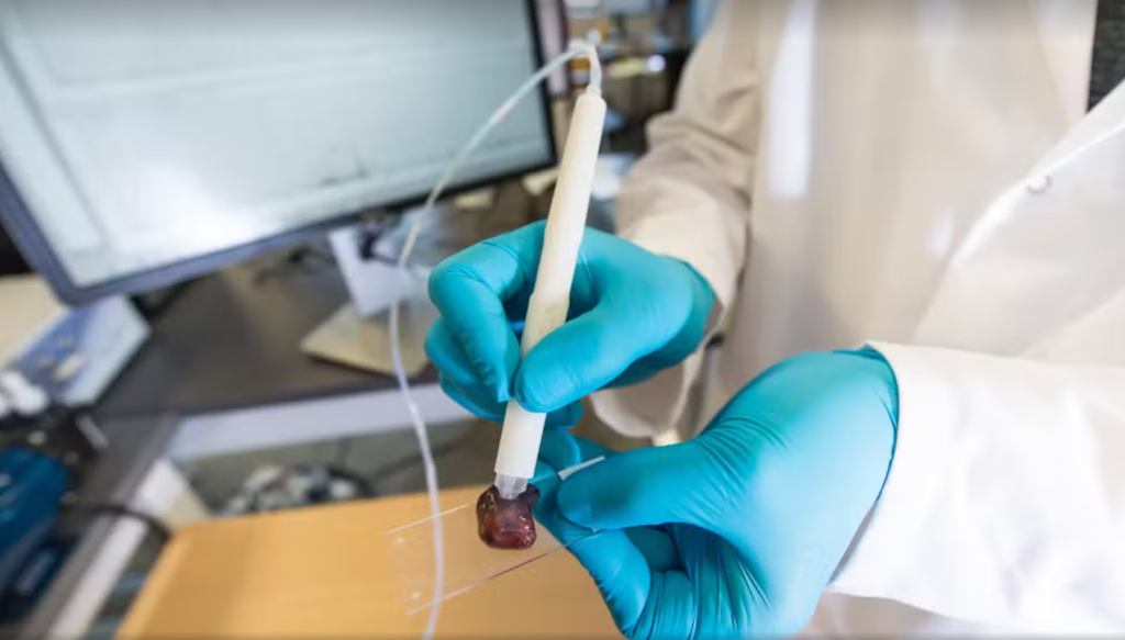 Durante a cirurgia, o médico posiciona a ponta da caneta sobre o tecido suspeito. O dispositivo libera uma microgota de água estéril, que permanece em contato com o tecido por alguns segundos, extraindo moléculas da superfície. Essa gota é então aspirada para o espectrômetro, que analisa sua composição molecular em tempo real.