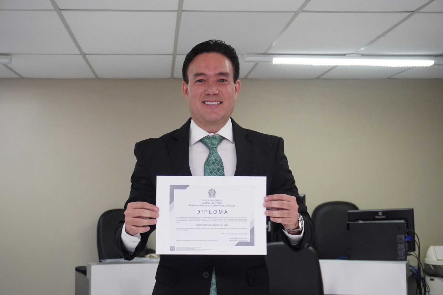 O prefeito reeleito de Jundiá, Jorge Galvão, foi diplomado nesta terça-feira (16), na comarca de Portugal, em cerimônia que oficializou o início de mais um mandato à frente do município. Ao lado da mãe e de sua namorada, Jane Moura, prefeita de Senador Rui Palmeira, Galvão celebrou a conquista, destacando a continuidade do trabalho realizado em sua gestão.