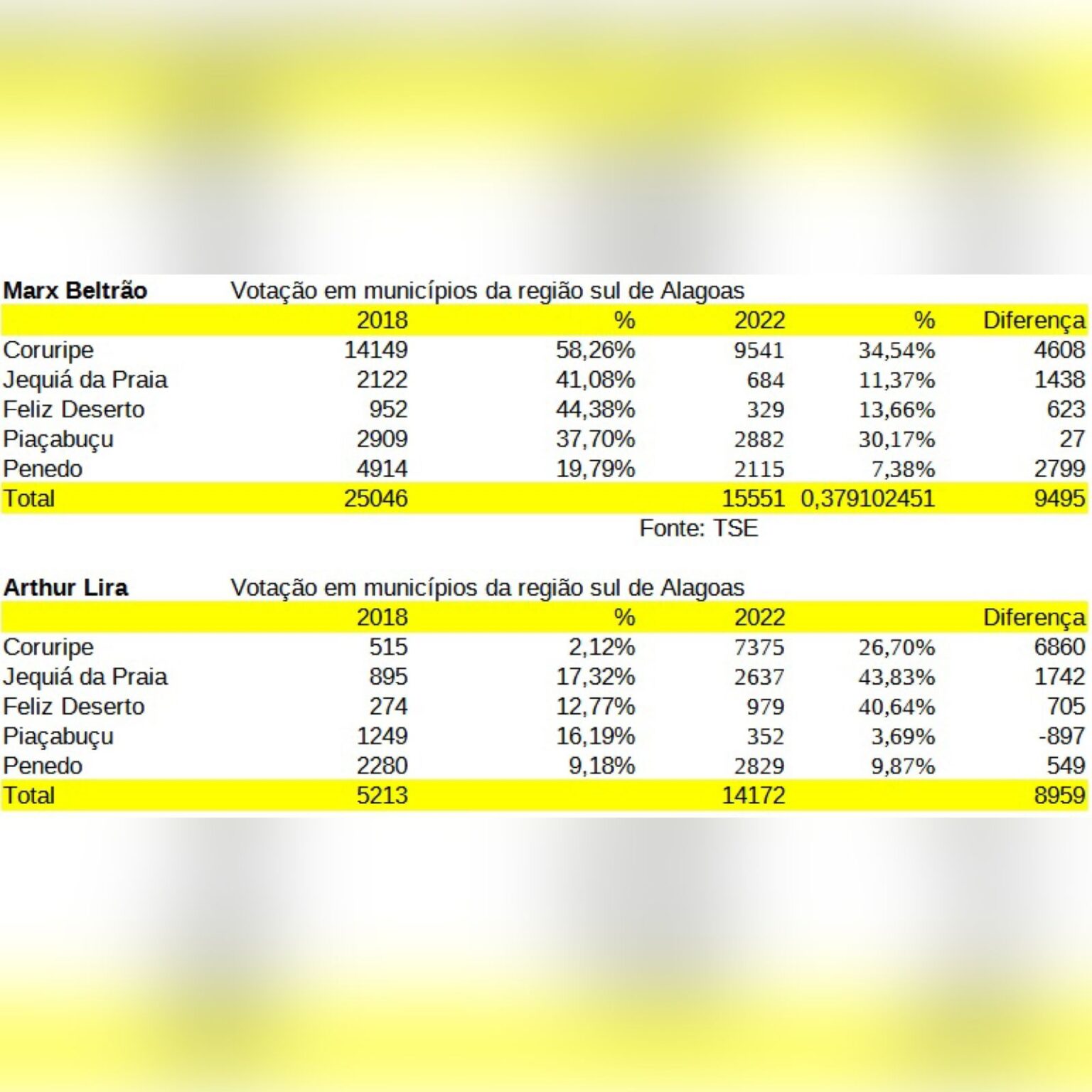 Em Coruripe, Arthur Lira (PP), candidato apoiado pelo prefeito Marcelo Beltrão foi segundo mais votado (veja tabela), saltando de 515 votos para 7,3 mil votos, um crescimento de mais de 1,3mil% na votação.
