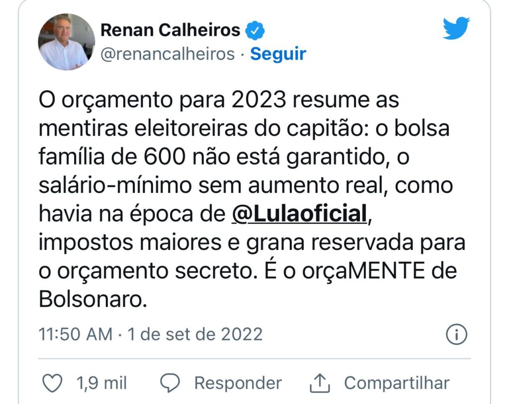 “O orçamento para 2023 resume as mentiras eleitoreiras do capitão: o bolsa família de 600 não está garantido, o salário-mínimo sem aumento real, como havia na época de @Lulaoficial, impostos maiores e grana reservada para o orçamento secreto. É o orçaMENTE de Bolsonaro”, escreveu Calheiros.