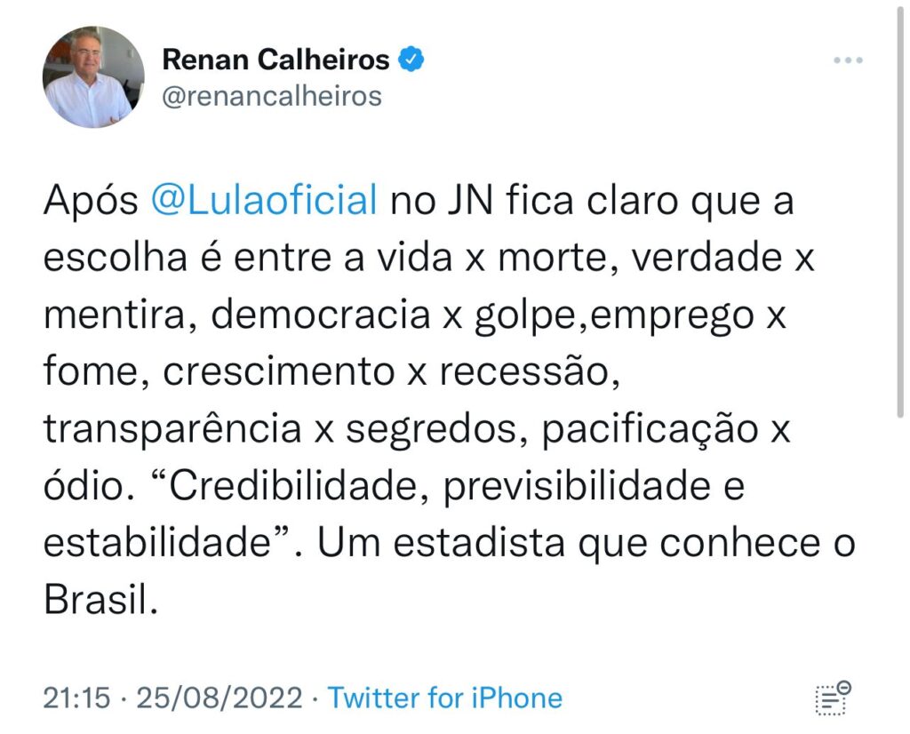 O senador Renan Calheiros (MDB) usou o Twitter na noite de hoje, 25, para comentar a entrevista de Lula, candidato à Presidência, no Jornal Nacional.