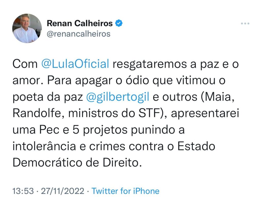 “Com @ LulaOficial resgataremos a paz e o amor. Para apagar o ódio que vitimou o poeta da paz @ gilbertogil e outros (Maia, Randolfe, ministros do STF), apresentarei uma Pec e 5 projetos punindo a intolerância e crimes contra o Estado Democrático de Direito”, escreveu Renan Calheiros no Twitter.