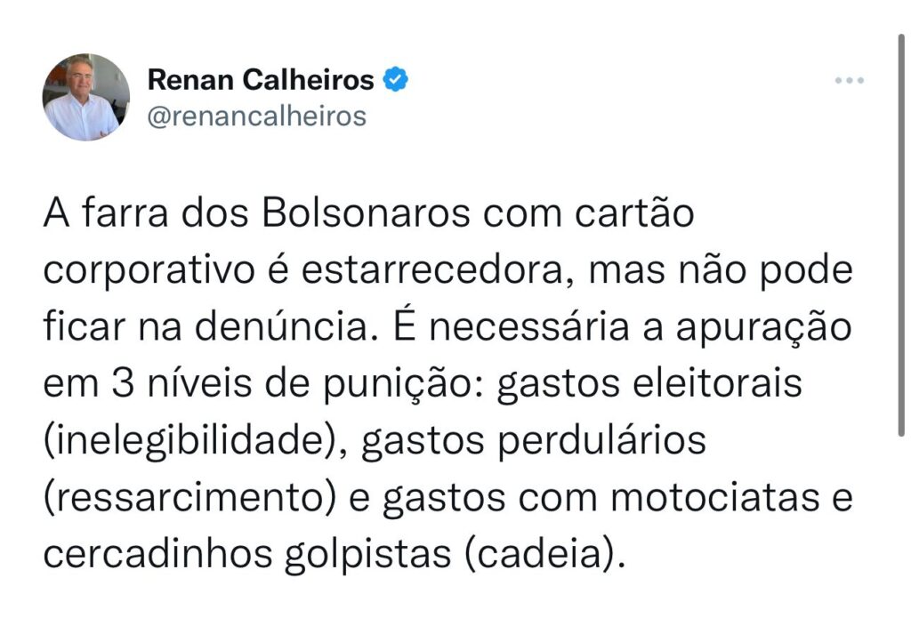 “A farra dos Bolsonaros com cartão corporativo é estarrecedora, mas não pode ficar na denúncia. É necessária a apuração em 3 níveis de punição: gastos eleitorais (inelegibilidade), gastos perdulários (ressarcimento) e gastos com motociatas e cercadinhos golpistas (cadeia).”, disse Renan Calheiros.