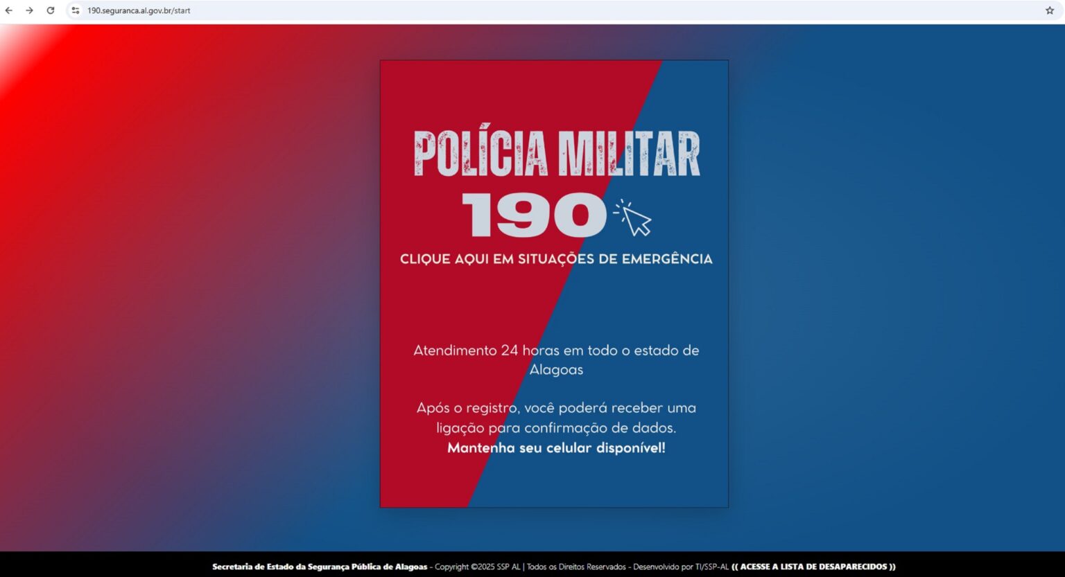 A Secretaria de Estado da Segurança Pública de Alagoas (SSP/AL) lançou um novo serviço para acionamento de emergências. Agora, além do tradicional telefone 190, a população pode solicitar atendimento policial através do site 190.seguranca.al.gov.br. A plataforma funciona 24 horas por dia e foi criada para ser uma alternativa ao contato telefônico, especialmente em locais com sinal de celular fraco ou para pessoas com dificuldades de comunicação.